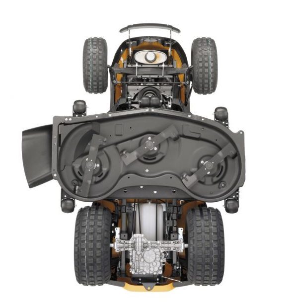 Бензиновый садовый трактор с двигателем Briggs & Stratton объемом 724 куб. см, режущим механизмом шириной 121 см с тремя ножами.