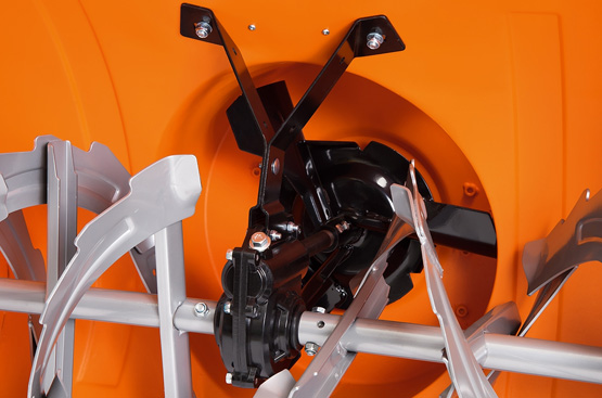 Усиленный редуктор в стальном корпусе передает до 95% крутящего момента двигателя. Срезные болты на шнеках защищают редуктор от перегрузок. Выходной вал редуктора крепится на подшипниках большого диаметра, что обеспечивает высокую устойчивость механизмов к вибрации и ударам.