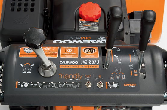 Панель управления с системой изменения скорости передвижения, направления и дальности выброса снега обеспечивает комфортное управление и работу снегоуборщиком.