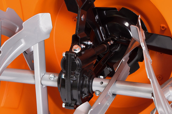 Усиленный редуктор в стальном корпусе передает до 95% крутящего момента двигателя. Срезные болты на шнеках защищают редуктор от перегрузок. Выходной вал редуктора крепится на подшипниках большого диаметра, что обеспечивает высокую устойчивость механизмов к вибрации и ударам.