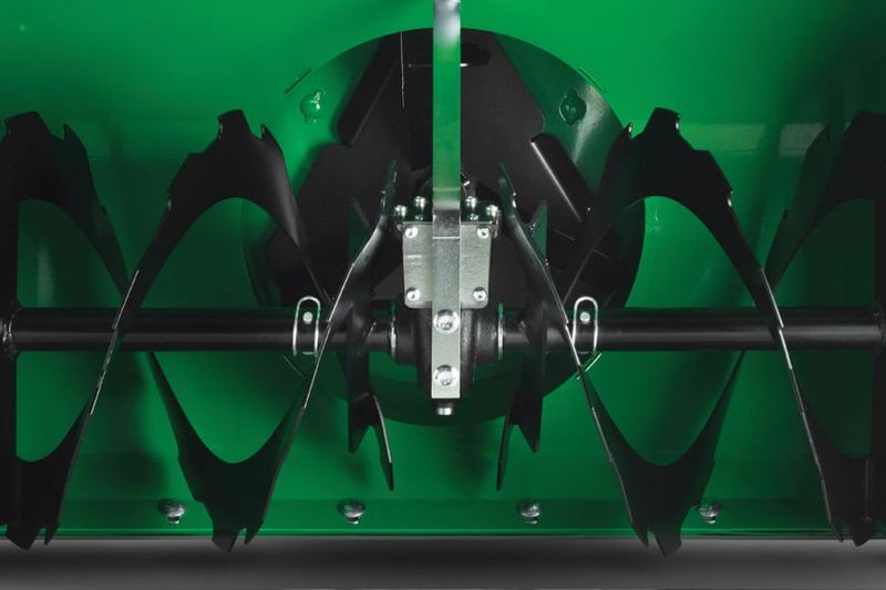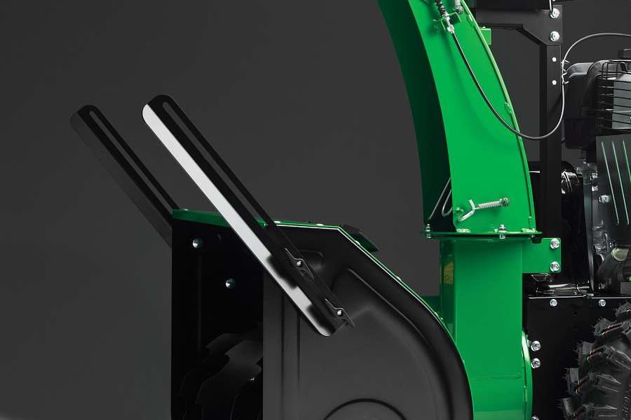 Второй каскад. Частота вращения крыльчатки - 1200 об/мин. Лопасти крыльчатки, выполненные в форме «чаши», усилены металлическими пластинами. Благодаря такой конструкции снегоуборщик способен отбрасывать снег на расстояние до 20 метров. Дефлектор выброса снега полностью выполнен из металла и оснащен дистанционным управлением.