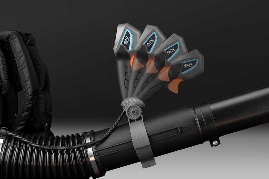 Регулировка скорости позволяет выбрать оптимальный режим мощности подачи воздуха: имеется 4 скоростных режима. Четвертый (турборежим) – это максимальное ускорение воздушного потока (до 90 м/с) и максимальная производительность (до 1360 кубометров в час) для работы в наиболее сложных условиях.