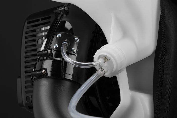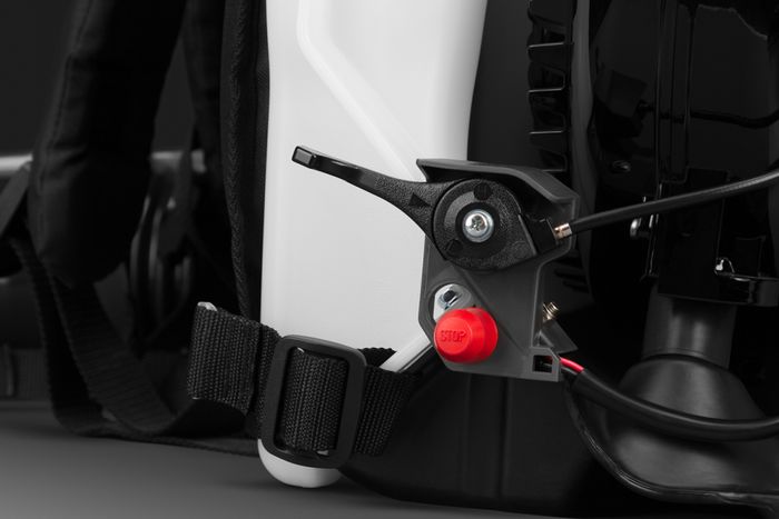 Широкие, мягкие, удобные лямки, отстегивающиеся при помощи карабинов. Воздуходувка легко одевается на спину: сначала на одно плечо, затем пристегивается вторая лямка. Такая система удобна как правшам, так и левшам. Уникальная система вентиляции на спине отводит тепло и влагу для комфорта работы.
