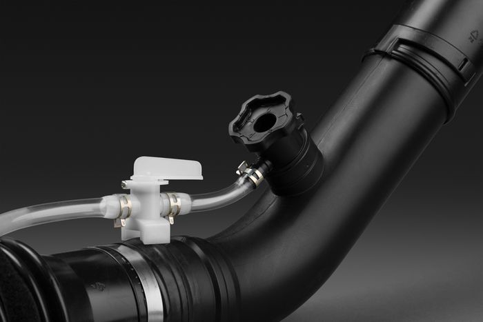 Регулируемая форсунка, производительностью до 4 л/мин, расположена в самой нижней части дефлектора, ниже уровня бака. Это позволяет на 100% использовать весь объем жидкости в баке. У аналогов регулятор располагается на кончике трубы, что не позволяет использовать всю жидкость - часть ее остается в баке.