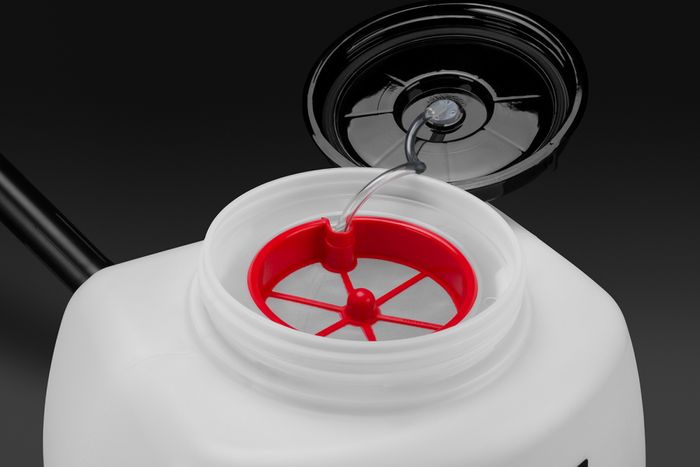 Бак для жидкости имеет широкую заливную горловину. Уплотнительное кольцо крышки исключает протечку, оно выполнено из бутадиен-нитрильного каучука, устойчивого к агрессивным жидкостям. Сетчатый фильтр препятствует попаданию в бак крупных частиц, мешающих подаче раствора.